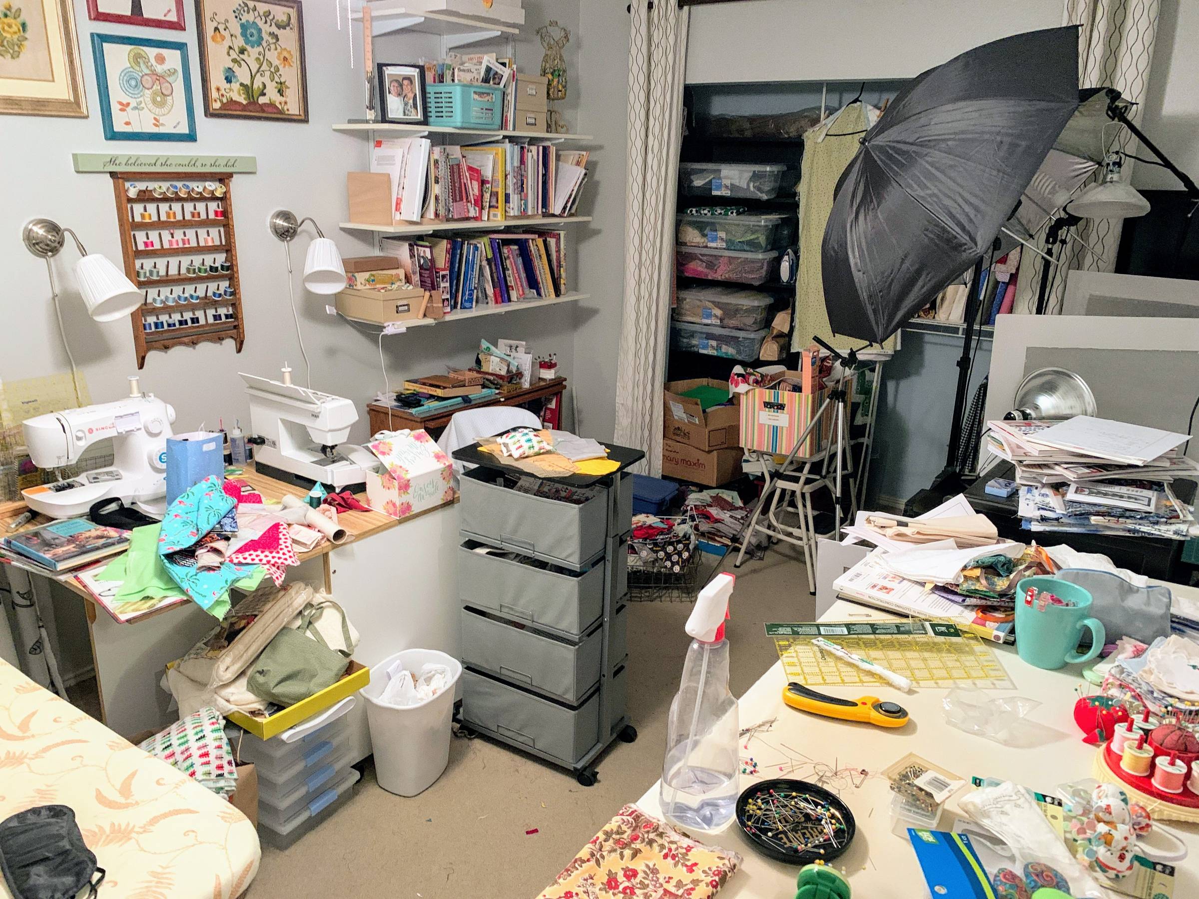 The first two ideas are how my friend Pat stores her quilts, and the photos are from her home. (Shared with permission.) My sister uses the vacuum bags. I repurposed a large TV armoire to be used for quilt storage (3) and also use a free standing quilt rack that belonged to my mom (4). Storing finished projects can be a challenge. I'd love to hear about what you sew and the solutions you use. You can reply to this email, and please send some photos if it's not too much trouble. Sewing Space PlaybookIn the last newsletter, I shared the challenges I've been facing related to my sewing space and how I solved them in the past. My plan was to finish a couple of commissioned quilts before tackling my out-of-control stash, but my mind and heart are telling me NO. I'm not quite done with the quilts, but I don't want to wait any longer to get started with Sewing Space Playbook (SSPB). It's a process I know works. These pictures show my first sewing room transformation. Since then, I have successfully used steps from the playbook a second time when I shifted parts of my sewing space to another room. I'll be following the proven SSPB process again to sort through, reorganize, and redesign my current dedicated sewing space so it's a place where I want to be instead of room that crushes my soul. The proven process is made up of 8 Plays and the current state of your sewing space will determine what play you start with. If your sewing space is hindering your quilting/sewing or you've been thinking about making some changes but didn't know where to start, Sewing Space Playbook may be exactly what you need.