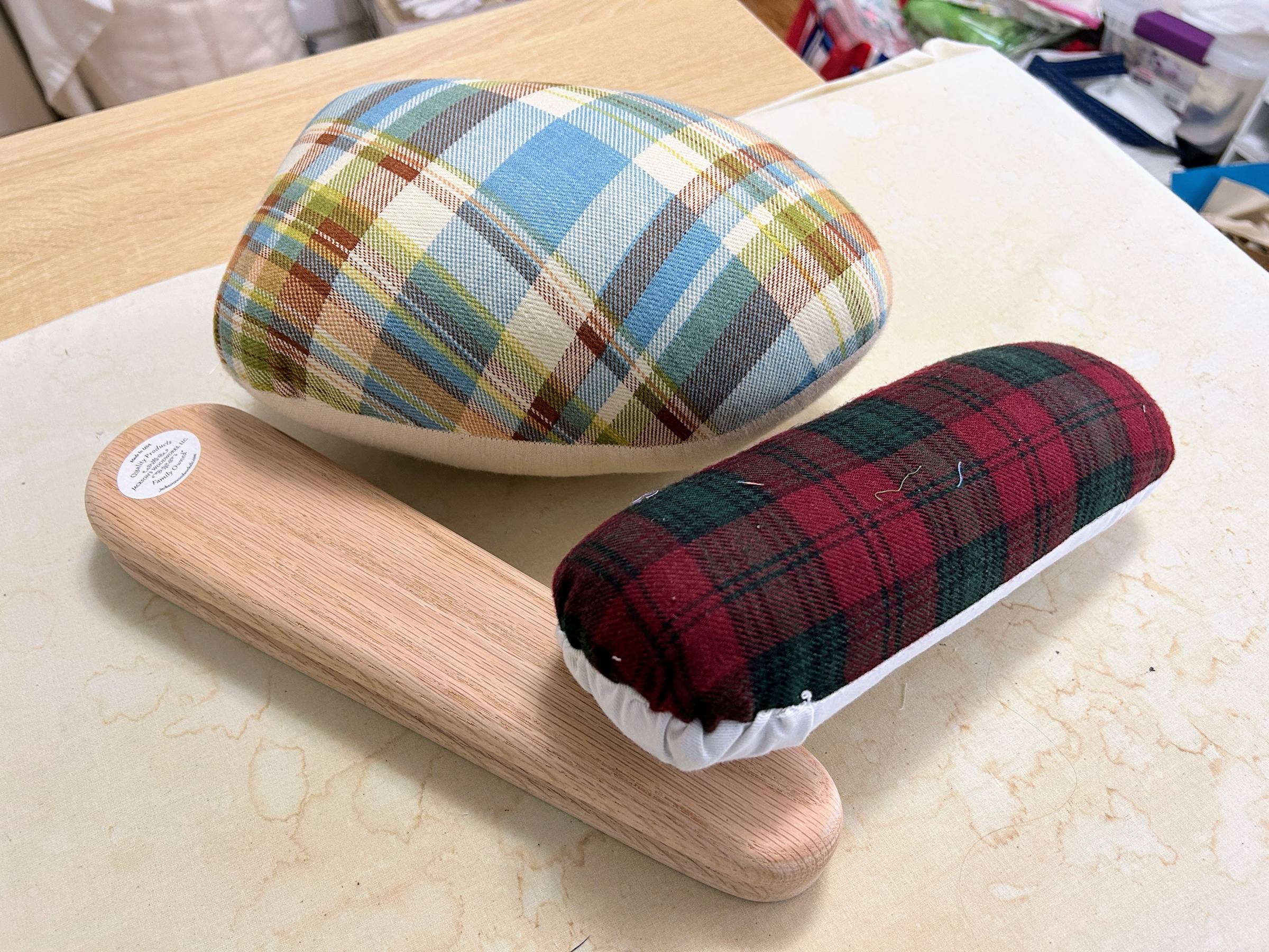 I hope you'll join me in creating a space where you love to sew! Not interested in Sewing Space Playbook right now? Click here to let me know and you won't hear about it again during this promotional period. Don't worry. You'll still get the Snappy Scissors newsletter. 😀 Pressing ToolsHave you ever heard the saying, "The difference between handmade and homemade is proper pressing."? Pressing is an important part of the construction process whether you're sewing or quilting because it helps to set stitches, flatten seams and hems, smooth out puckers, and even shape fabric into darts, pleats, and curves. Pressing is the action of pushing the iron lightly but firmly down on the fabric then lifting and moving it to press down again in another area. This is different than ironing which is moving the iron back and forth when the heated plate is touching the fabric. (Like you would do when getting wrinkles out of clothes or a large piece of fabric.) When the iron is set to the correct temperature for the fabric you're working with, you can get some great handmade results when pressing. But did you know, there are some additional tools you can use to achieve even more amazing results? I have a couple of tailor's hams and use them to press curved seams when making garments. I also have a wooden clapper that I'll pull out when I need some extra help in getting seams to lay flat. The clapper has been very helpful as I've worked on some pinwheel blocks to flatten bulky seams. My clapper is from Jackson's Woodworks LLC. They have a video showing some of their sewing and quilting tools for both garments, quilting, and other types of sewing. If you want to learn more about clappers or make your own tailor's ham, check out the following resources.